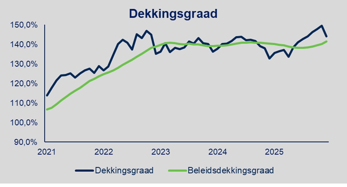 De dekkingsgraad per eind december 2025 is uitgekomen op 144,2% (per eind november 2025 149,5%). De beleidsdekkingsgraad per eind december 2025 is uitgekomen op 141,4% (per eind november 2025 140,3%). Let op: De beleidsdekkingsgraad is het gemiddelde van de laatste 12 maanden.